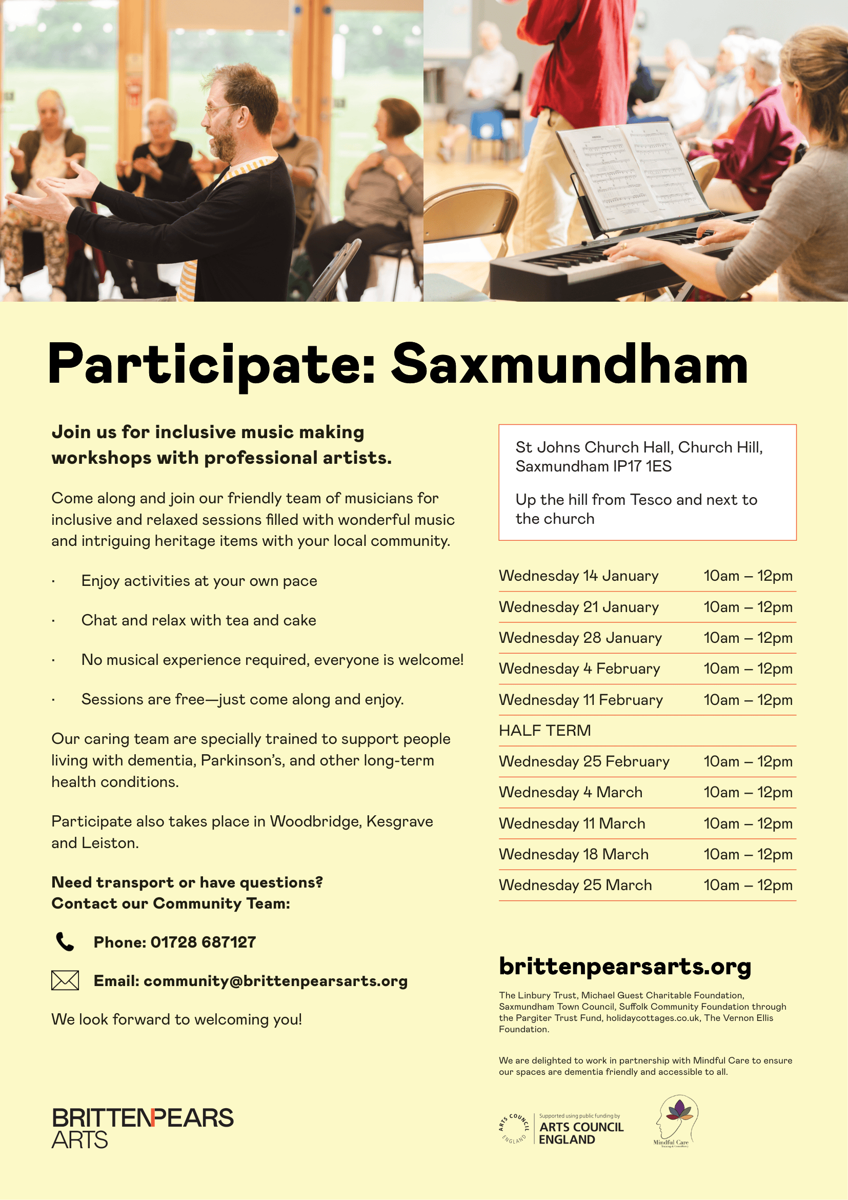 St Johns Church Hall Church Hill, SaxmundhamCome and explore objects and music with our friendly team of workshop leaders and musicians. These sessions will bring you together with others in your local community, providing an opportunity to take part in activities and connect over tea and cake. Sessions last for two hours and tea and cake is provided. No musical experience […]
