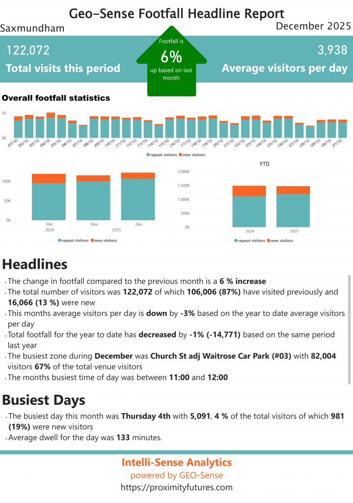Footfall data can be useful for businesses in Saxmundham to assess their activity and plan for the future. If you would like to know more about the footfall data, please contact us.